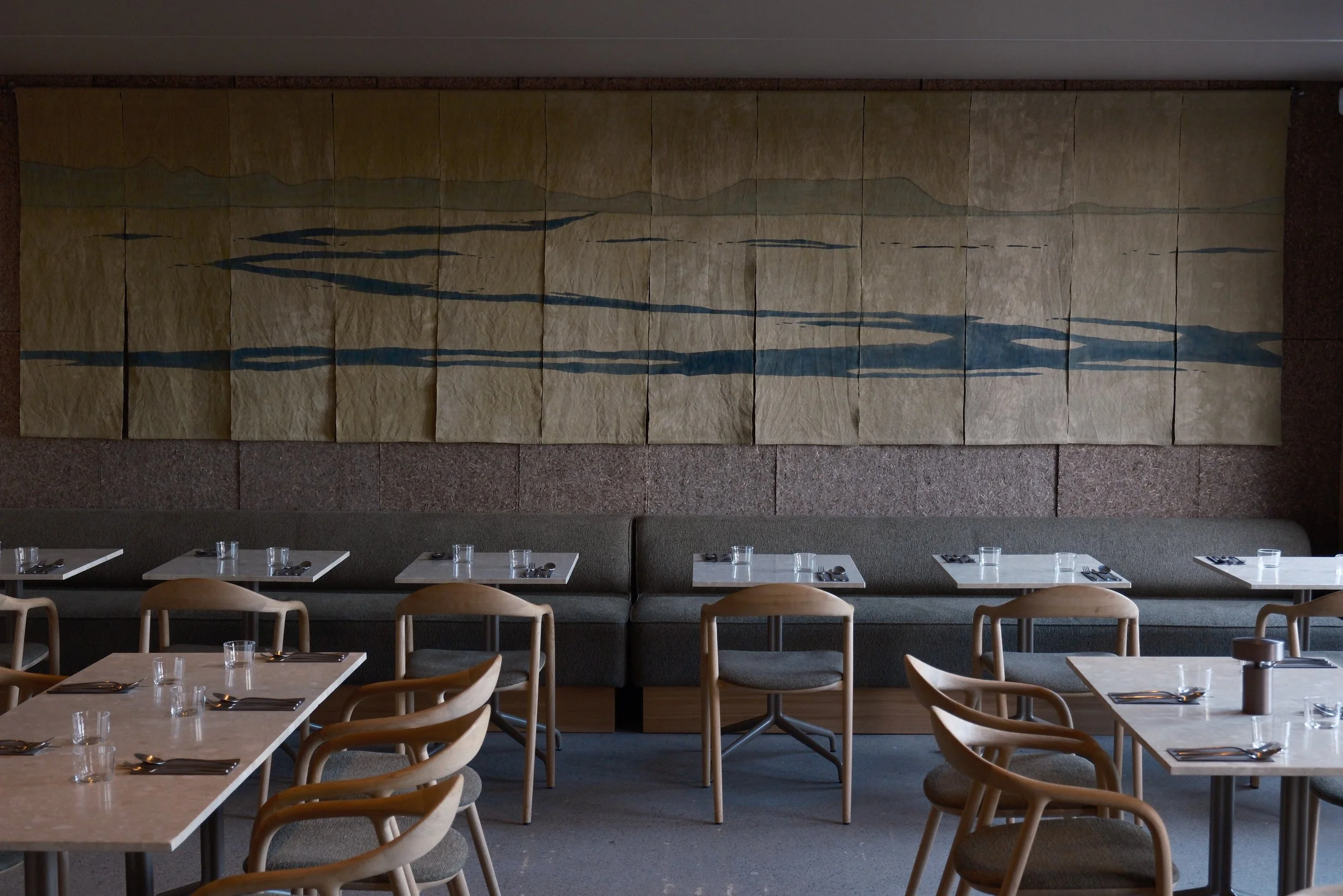 In 2025, I created Hvítá, a large-scale textile artwork for Ylja Restaurant at Laugarás Lagoon in southern Iceland. Developed through hand-cut stencils and natural dye processes, the work forms part of the restaurant’s architectural setting.