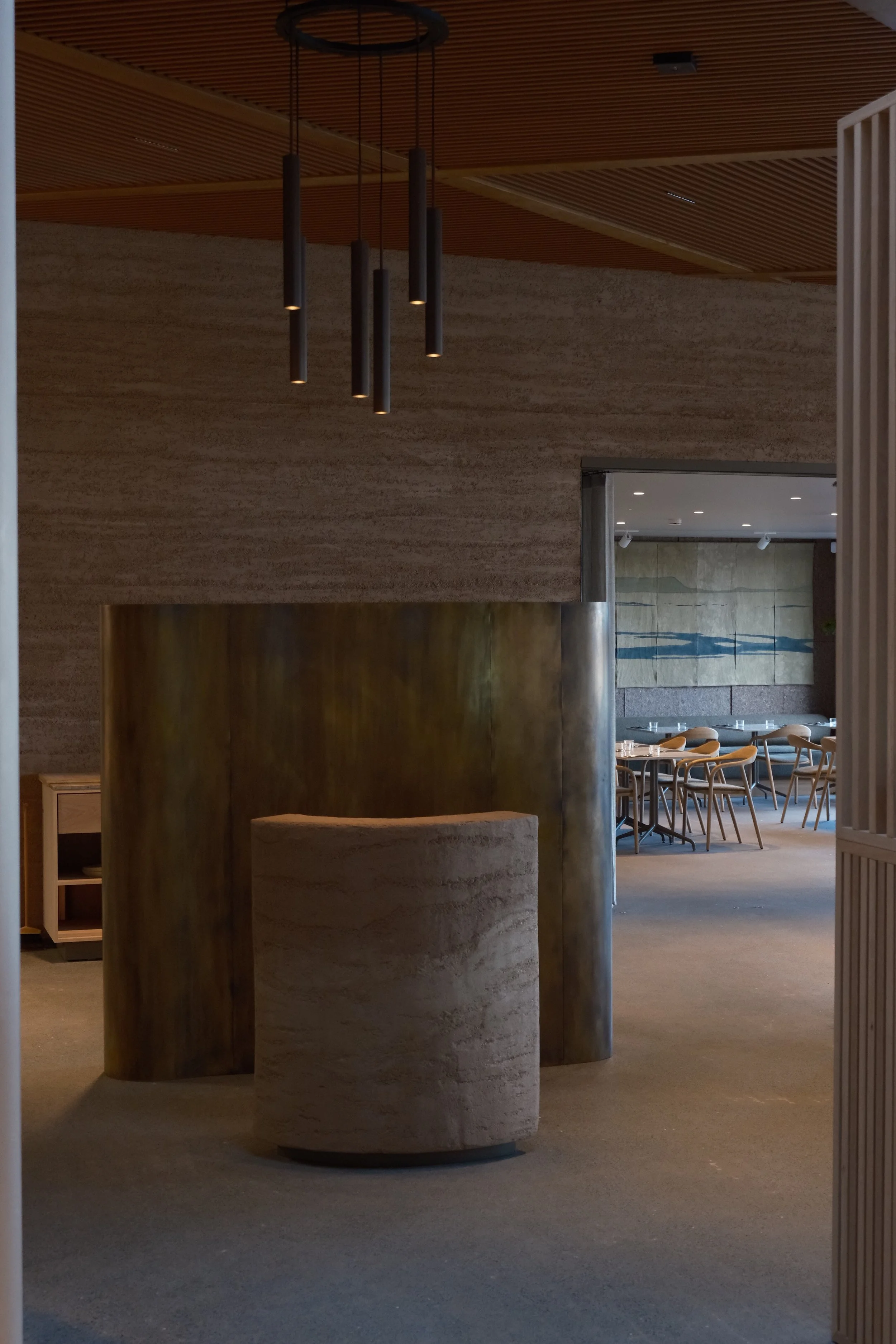 The artwork was commissioned for Ylja Restaurant by Gísli Matt, located at Laugarás Lagoon. In addition to creating the artwork, I was part of the design team behind the restaurant, working in close collaboration with interior designer Anthony Bacigalupo and TARK Architects. The project brought together architecture, craft, and cuisine in direct relationship with the surrounding landscape and the river itself.
