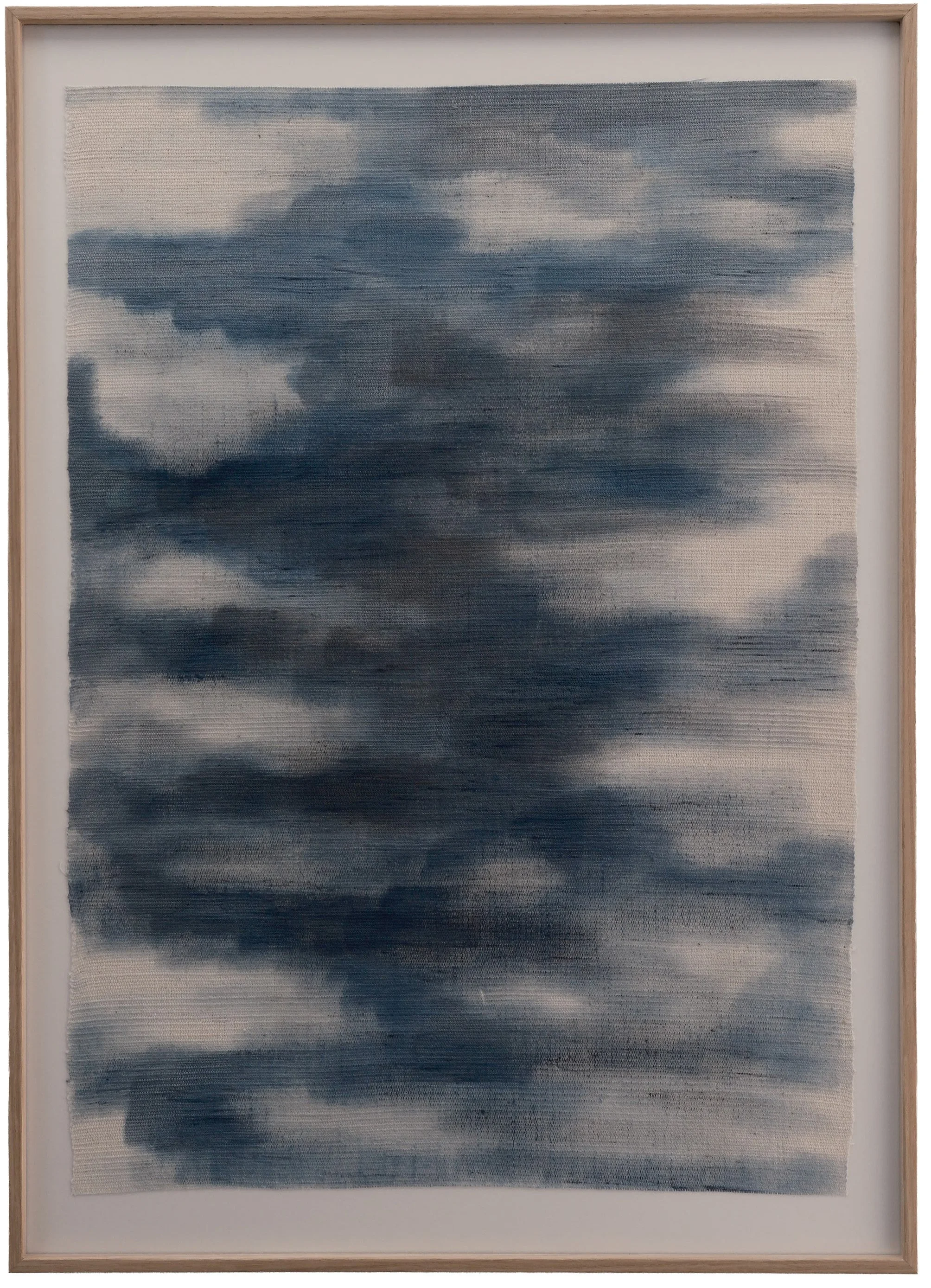 Ramie, indigo, sumi. Framed in steel with oak veneer, protected by non-reflective glass.